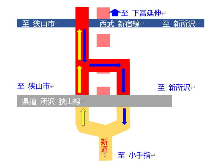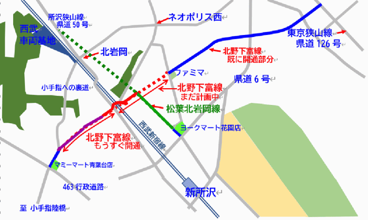 所沢狭山線(県50)と西武新宿線をまたぐ跨線橋を造り(図赤線)