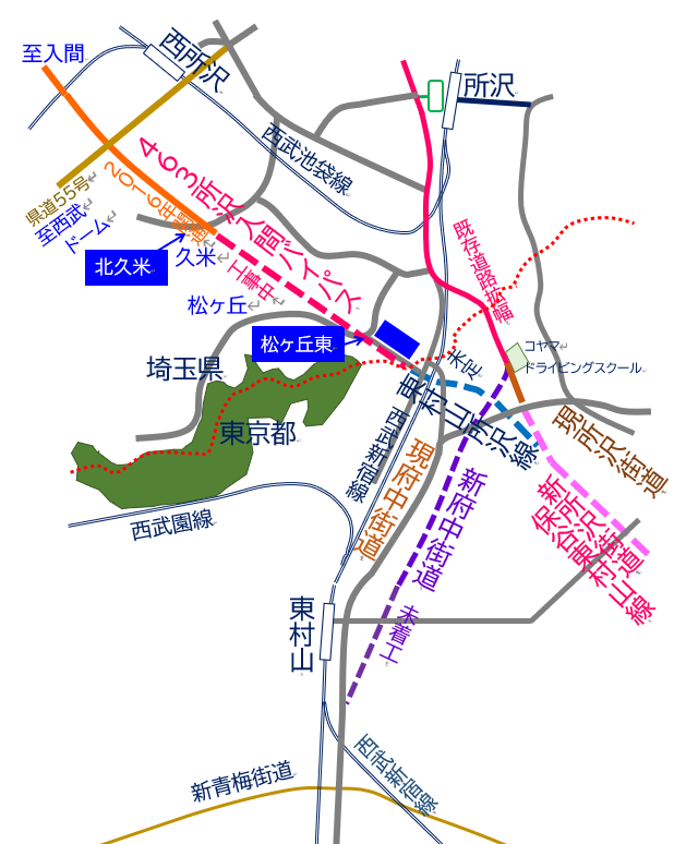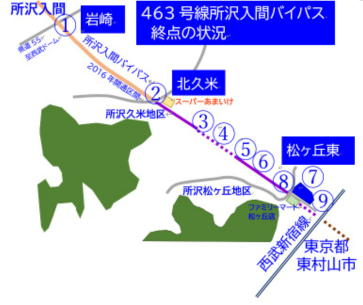 463号所沢入間バイパスは この先はどこへ? ![]() 463バイパス所沢市 久米 終点 定点観測 2024年1月 大きな進展なし 2024年4月 大きな進展なし 2024年9月 所沢駅エミテラス開業!! 2025年2月 大きな進展なし 2025年9月 新所沢街道・西先端部が東村山市 山崎製パン横に現実化して現れる 経度緯度35°46'18.9"N 139°28'40.3"E 463号所沢入間バイパスは航空写真で見ると 東京都の境で急に切れている 東村山市の計画を見てみるとなんと新府中街道と 新所沢街道に接続し東京区部方面、府中方面に 抜ける構想があることがわかりましたが 現在、東京都東村山市に入ったところで接続する 「東村山所沢線」は諸事情により 進まない状況です 埼玉県民といたしましては ここがつながると都内アクセス強化に つながるのですが… なお、東村山所沢線の正式路線名は 「東村山3・4・35号線」となります 埼玉県と東京都のアクセス構想 463号所沢入間バイパスが 新道 東村山所沢線につながった場合 新府中街道(延伸事業中)と 新所沢街道(保谷東村山線)に つながる都内へのアクセス主要道路となる 構想でした ※東村山所沢線 東村山3・4・35号線 463号所沢入間バイパスの終点は どうなってるの? 現在所沢入間バイパスの南端は西武ドームに 至る県道55線から北久米交差点までが 2016年に開通し、その先 北久米交差点から松ヶ丘東交差点まで 延伸工事を行っていますが その延伸工事中間地点で諸事情により 工事がストップしている状況です… 終点より先は東京都東村山に入るわけですが、 東京都側の接続が事情によりストップしているため、 現状としては狭い道が受け入れ道路と なりますので安全面では大きな道路が 必要なのではないでしょうか では、所沢入間バイパスの終点の状況を 見てみましょう |