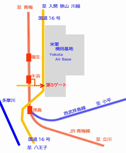 横田基地は東京多摩西部の福生市に位置し