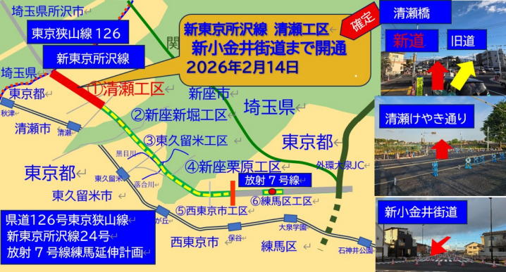 新東京所沢線 @清瀬工区 2026年1月版 新東京所沢線開通日決定!! 清瀬橋→新小金井街道まで 2026年2月14日開通決定!! ![]() ![]() 清瀬橋拡幅工事完了!! ![]() 地点@ こちらの枝分かれで新道と旧道に分かれます おおよそ20年くらいこの道を追ってきましたが ようやく3年くらい前から大幅に工事が進み始めました 当初、電気店のあるけやき通りまでの開通工事と 思われましたが、一変して駐在所のある志木街道を経て 新小金井街道まで工事が進み始め、今まさに 開通に向けての工事が進行中であります。 ![]() 地点A 遠くに見えているのは東所沢と東京都清瀬市の境にある 大絶壁のマンションです しかしまー東京に入ると片側1車線になるんですね、 これで放射7号線まで開通した時、 交通量の収容能力が間に合うのでしょうか? 開通前から心配だ! ![]() 少し進むと押しボタン信号が設置されております 地点B けやき通り 電気店交差点 ![]() 清瀬駅から出ている「けやき通り」の電気店がある 交差点の状況です。ここで今回の工事は終了と思いきや 去年あたりから急に20年の沈黙を破るべく工事が いきなり始まりました ![]() 4年前の「けやき通り」の状況がこちらですから 大きな進展です(2021年1月の状況) ![]() 今年2025年2月の状況です ![]() 2024年9月の状況 東京の道路開通サイトの方が道路開通工事が 更に進んでいるとのレポートを聞きつけ 見に行った時にはこんなに出来上がって いましたからね、これは驚きましたよ! 地点C ![]() おうおうできてます。 ここは1年くらいでできちゃいましたね 地点D ![]() 地点D駐在所・志木街道の状況です 少し見えずらいですが、ほぼ完成しております あとは交差点接続工事の仕上げ工事を待つ 状況となってきました。 ![]() 去年2025年7月の状況です。 この時、あれ進んでるって気づいた くらいなんですから早かったです 地点E 志木街道と新小金井街道の中間点 ![]() おおおーできてる ![]() 去年2025年の7月の状況がこれですからね ずいぶんとまあできあがりました。 地点F新小金井街道交差点の状況 ![]() 信号を設置すれば完成の状況となりました。 この区間は急ピッチで進みましたね! ![]() 去年2025年の7月の状況 新小金井街道交差点の状況です。正直言って、ここまで 自分の人生の内、進むとは思っていませんでした ここまで開通すると大きな進展になります ![]() 東京練馬方面はこのような状況です。 この先が、ほとんど計画線上が広大な 住宅地地域となっており、何年後、はたまた何十年後に 開通するかわかりません、しかしながら、地図を見ると 西武池袋線の東側は広大な住宅地帯と化しており、 幹線道路が無く、もし災害が起きた場合、緊急輸送道路が 存在していないのが現状です。ナビでさえ物凄く小さな 住宅道路を選んで誘導してきます。そういった観点から 観ていくとやはり必要な道路であり、早期の開通を 願うばかりでありますが、現状は難しい状況です。 新東京所沢線 清瀬工区 埼玉県西部地区道路計画Google MAP ※この地図は確定路線ではありません概ねこの辺を通ります Google MAP 拡大はこちらから |