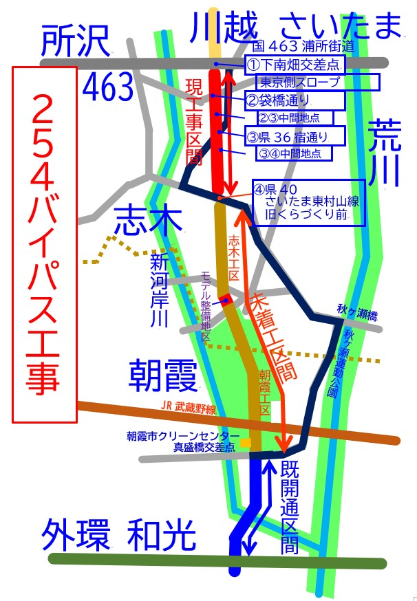 地点B県道36号線 宿通り 川越方面 ![]() 県道36号線との接続工事も完成し あとは開通を待つのみの状況になってきました ![]() 2022年12月 本線が完成状態でこれから舗装、 既存県道との接続工事に入る状況です 信号は設置されております ![]() 2022年6月の状況 東京方面 ![]() こちらも交差点接続工事が完成 ![]() 2022年12月 ![]() 2022年6月の状況 6月の時点で信号が設置されておりました この地点が信号の設置が一番早い 場所になります |