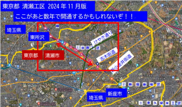 | 新東京所沢線 @清瀬工区 @清瀬工区 2024年11月版 あと数年で開通しそうだ!! (撮影2024年9月下旬) ![]() ![]() 長年進んでいなかった埼玉県と東京都が 入り組んだ地域、ここが大きく動き始めた!! ![]() ![]() 過去 2022年11月 極めつけはこの場所ですね、 電気屋さん近くのけやき通りの 現在の状況です ここは十数年間このままでした この場所の工事が動き出しました では順路通りに進んでみましょう ![]() ![]() 清瀬橋を渡り東京都清瀬市に入ります ![]() ここから新東京所沢線が分岐します ![]() 清瀬橋から けやき通り までは ほぼ完成している状況です ![]() 東京都のイチョウマークが 入りましたね、 歩道の防護柵まで完成しています 東京都内からおそらく 片側一車線になると思いますが キャパシティーに耐えることが できるんでしょうかね〜? ![]() 青看板の土台もできてます そう遠くない年に開通することを 意味しています ![]() 電気屋さん交差点付近です ここで部分開通かと思ったのですが、 何やらこの先のけやき通り以降も 工事が始まりました 2024年半ばけやき通り以南 開通に向けての本格工事開始!! ![]() 東京都内の道路サイトさんの情報の元 けやき通りに行ってみました 10数年の沈黙を破り、なんとまあ工事が 本格的に始まっているではありませんか? これは大きな一歩です!! ![]() これが過去10数年間の状況でした ![]() けやき通り と 志木街道 の中間地点の 状況です いや〜進んでますね〜 数年後の開通が期待できる状況です ![]() 志木街道 駐在所前交差点の状況です ここまでは数年後に開通しそうな きざしです 楽しみですね〜 新東京所沢線 清瀬工区 埼玉県西部地区道路計画Google MAP ※この地図は確定路線ではありません概ねこの辺を通ります Google MAP 拡大はこちらから |