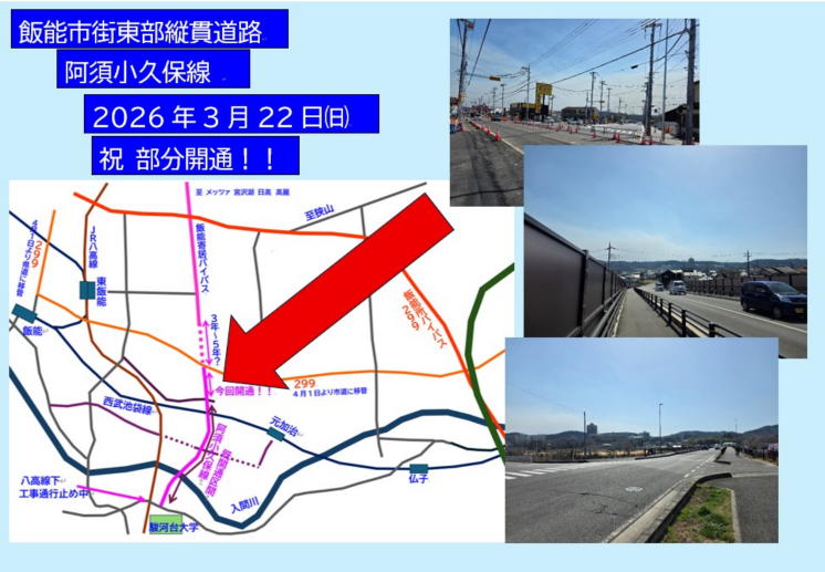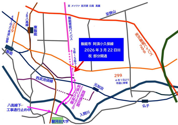 2026年3月22日 飯能市 阿須小久保線 部分開通 ![]() ![]() ![]() 飯能市街地 現299六道交差点近くに新しい道が 開通します。 この道が開通することにより、飯能市街地の南北軸の 幹線道路網が強化され、埼玉県西部地域の 交通の円滑化につながることが予想されます。 またこの道路は飯能寄居バイパスの延長線に位置し、 今回開通の交差点より北側の未開通部分が開通する ことによって、飯能市街地からメッツァ・ムーミン宮沢湖 高麗・毛呂山・越生・寄居方面へ直結する埼玉県西部に とって主要な幹線道路になりうる道路でもあります。 ![]() 現299からこの交差点までが 今回の開通区間になります ![]() 岩沢陸橋 西武池袋線をオーバーパスする岩沢陸橋から 入間川を渡る阿岩橋までが 2022年3月26日に既に開通しております ![]() ![]() ![]() ![]() 阿岩橋 ![]() ![]() 阿岩橋から見た入間川 歩道も広々として造られていて サイクリングするのに最高な景色でした 開通したらツーリングもいいですね ![]() 駿河台大学に到着です ![]() 阿須ガードが拡幅工事中で 車両通行止めになっていました 開通が楽しみですね! |