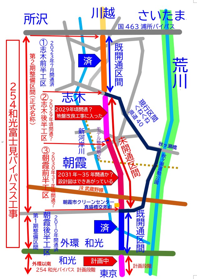 ![]() 2026年3月 和光富士見バイパス 2026年3月版 進む地盤改良工事!! ![]() 志木前半工区 既開通(第2期整備区間) 2023年7月29日 浦所バイパスをオーバーパスし 志木市内前半、未開通区間半分の1.4q 部分開通した!! 大規模な工事開始から3年かかった ![]() 祝!! 部分開通記念 3年間 一気見 3分間ver. ![]() YouTube版 走行画像 2分間ノンストップ 志木市内前半詳細 1.地点@浦所バイパスオーバーパス 2.オーバーパス東京方面 3.地点A袋橋通り 4.地点AとBの中間地点 5.地点B県道36号線宿通り交差点 6.地点BとCの中間地点 7.地点C 県道40号さいたま東村山線 旧くらづくり前 A志木市内後半工区(第2期整備区間) 2024年( R6)年度 着手 整地・準備工事 2025年(R7)〜2027年(R9)年度 地盤沈下対策・盛土・盛土撤去 2027年(R9)年度以降 道路本体工事 うまくいけば2028年3月頃か? B朝霞市内 前半工区(第2期整備区間) 2022年(R4)9月 武蔵野線交差部分 武蔵野線の高架の下を通る 地表式立体交差構造に決定 2025年現在 設計図はほぼ出来上がっている 2025年 今まで見られなかった草刈り作業始まる 2027年以降に工事着手し2028年度つまり 2029年3月頃開通か?しかしながら 地盤が弱く武蔵野線の下を通ることから 数年の誤差はあると見られる C朝霞市内後半工区(第1期整備区間) 既に開通済 和光市区間が2010年(H22)に暫定2車線開通し 2020年3月に全線4車線化完了し完成している D外環以南延伸工区 「国道254和光バイパス」という正式名称で 外環以南については埼玉県と東京都が協議し 2019年(令和元年)8月に新たに計画が決定した ![]() 和光富士見バイパス外環以南延伸計画 「国道254和光バイパス」計画始動!! 254和光富士見バイパス概要 一般国道254号線は東京都文京区を起点に 埼玉県西部地域を縦貫し、 長野県松本市に至る延長284kmの路線で、 埼玉県西部地域の富士見市から外環和光市に 至る区間を254和光富士見バイパスと呼ばれており、 埼玉県西部地域では並行する国道254号線川越街道が ひっ迫し、沿道地域の車両の流入など 道路環境の早期の整備、災害緊急時の 輸送道路の確保が現在求められており 早期の整備が求められている 埼玉県西部地域の主幹となる幹線道路で あります 県整備事務所公式資料 国道254号和光富士見バイパスPDF パンフレット ![]() 出典 県整備事務所 完成予想図 整備イメージPDF 浦所街道463号線下南畑〜県道40号くらづくり前まで 未来を想像させる完成度の高い整備イメージです ![]() 出典 県整備事務所 埼玉県西部地区道路計画Google MAP ※この地図は確定路線ではありません概ねこの辺を通ります Google MAP 拡大はこちらから 過去の月刊情報